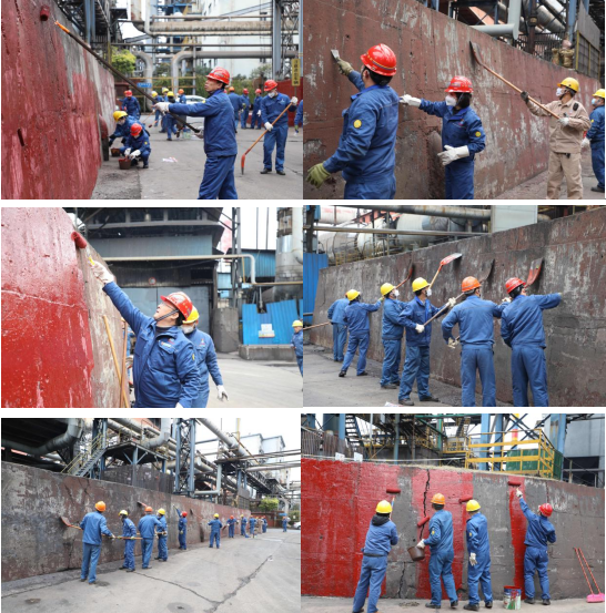 在現場,參與義務勞動的黨員幹部們分工協作,手持掃帚、鐵鍬、油漆滾筒刷等工具,有條不紊地對道路兩側圍牆進行美化亮化,鏟破舊牆皮、清掃牆麵、油漆粉刷各司其職。經過一個多小時的美化,高爐一路兩側的圍牆表麵煥然一新。