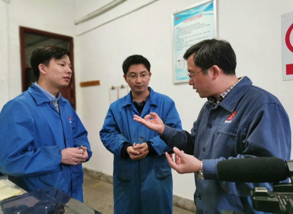 圖為化學分析高級工程師付誌軍(圖右一)在為青年技術骨幹講授化學分析新技能