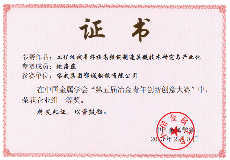 近日,中國金屬學會公布了第五屆冶金青年創新創意大賽結果。鄂城鋼鐵青年科技工作者獲得一等獎1個,二等獎2個,三等獎2個。