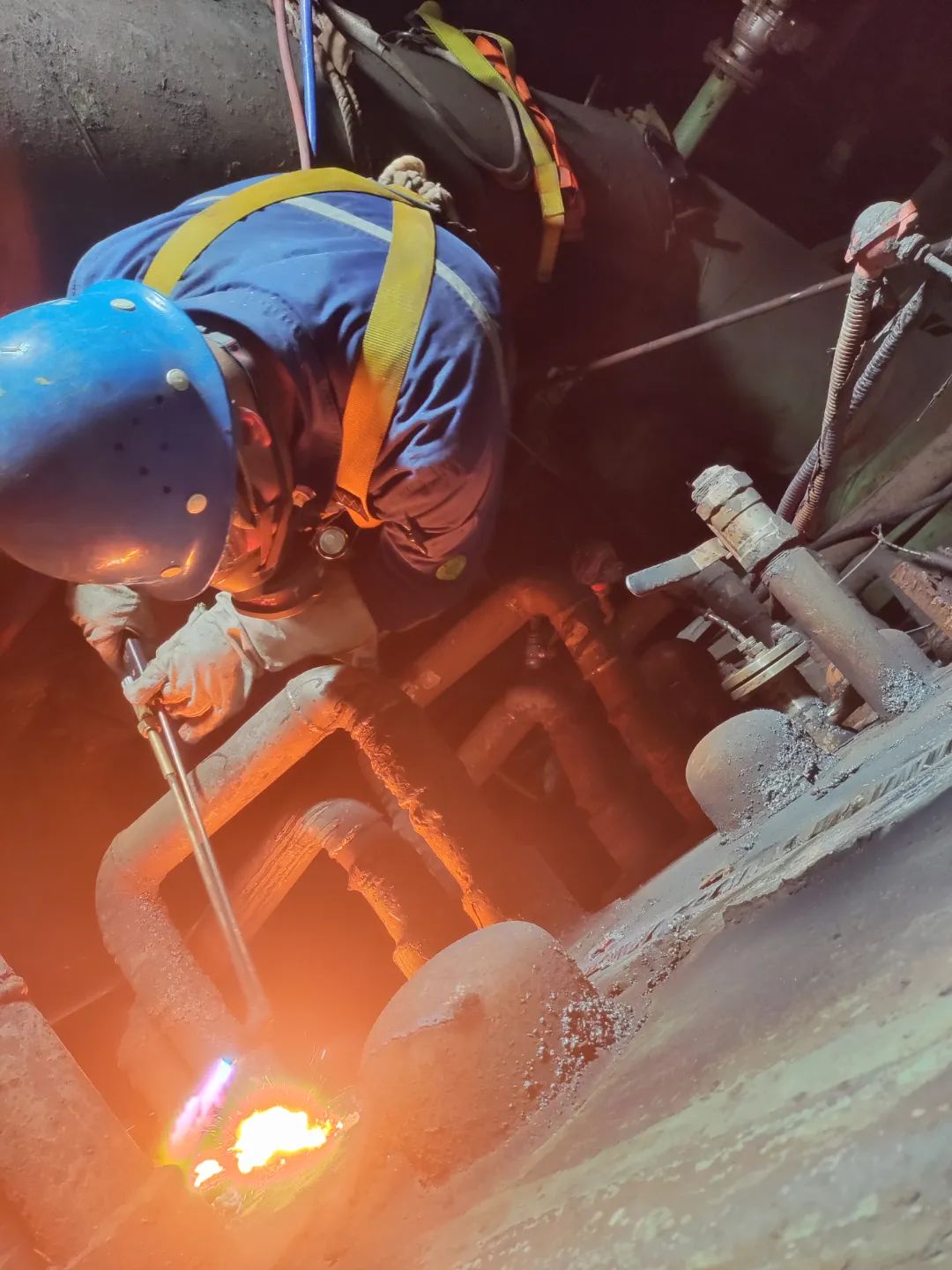 任務很重,過程很苦,“蜘蛛俠”們並沒有讓大家失望,他們用堅韌的毅力和精湛的技藝上演了一場焊工全明星秀。陶康、劉興勇焊完中場休息,吳開強、餘建兵就接著焊,田均、陳渝也摩拳擦掌,隨時接棒。他們輪番上陣,舉起沉重的焊槍和麵罩,累了就坐在平台上略微休息,恢複了就繼續焊接。