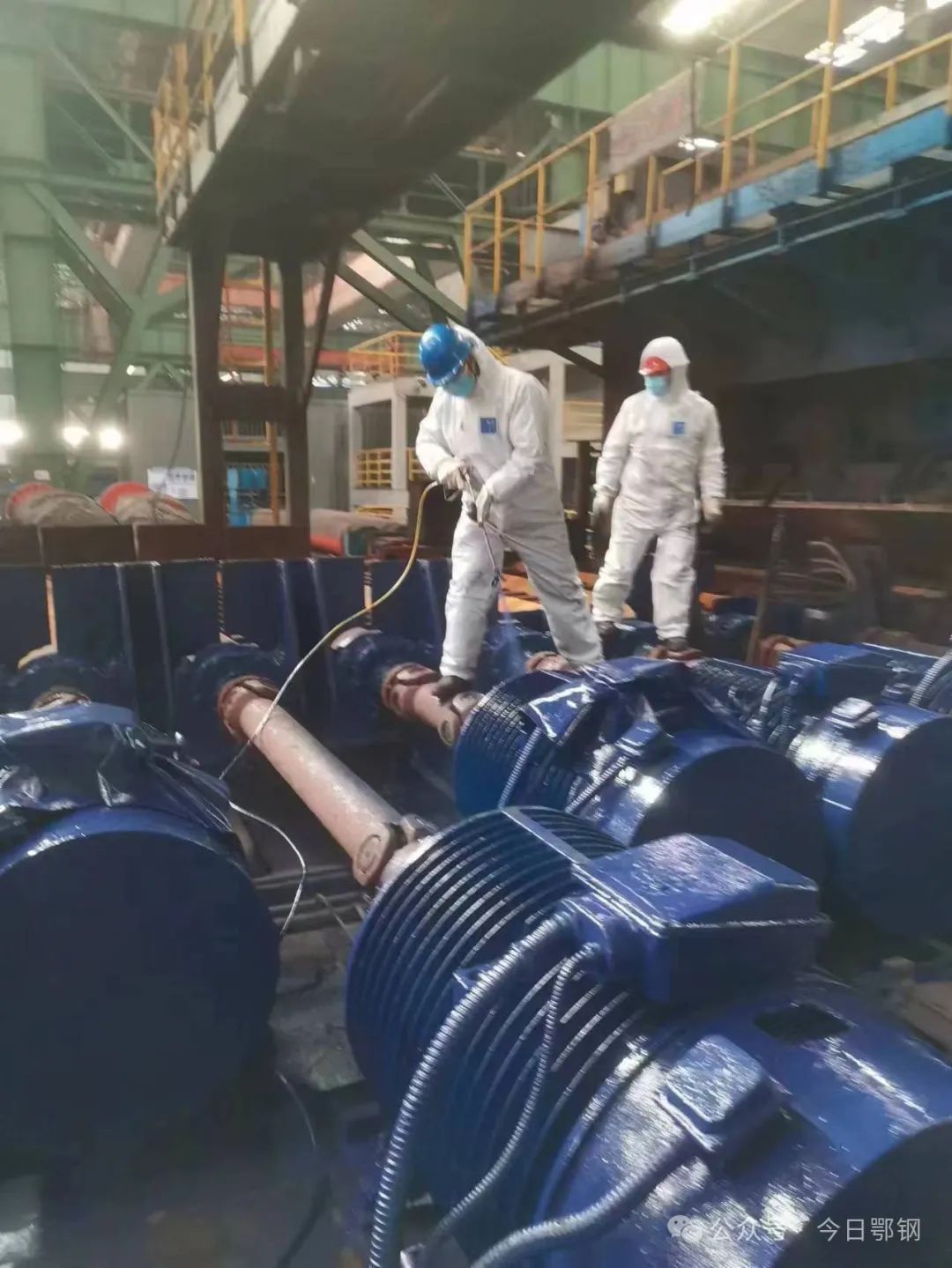 趁著檢修,軋材廠棒二產線各崗位職工給辛苦工作一年的油膩“老夥計們”洗了個澡,將軋機、飛剪和現場的樓梯欄杆、電機防護罩等設備都打掃幹淨,重新刷上油漆,穿上了“新衣服”。