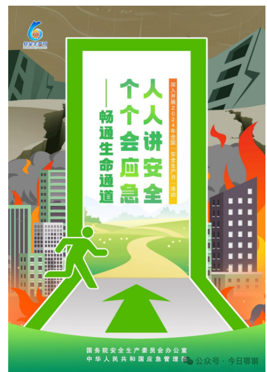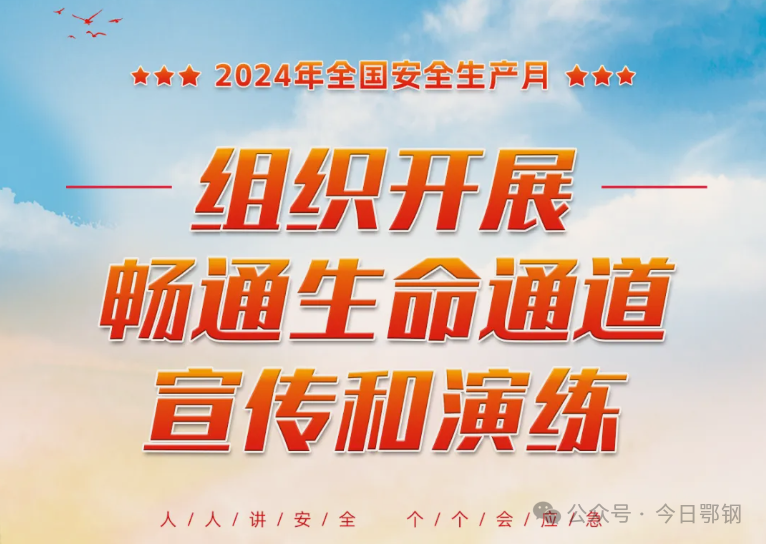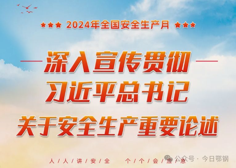 根據寶武集團、中南鋼鐵有關工作部署,各廠部要積極參加“安全生產大講堂”“安康護航”“健康寶武”行動專題培訓,公司也將結合實際組織全員安全考試,參與6月16日鄂州市“安全宣傳谘詢日”活動。
