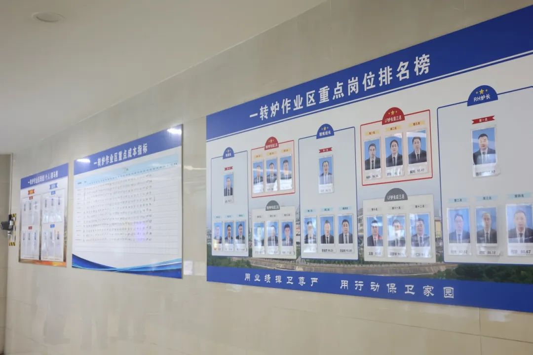 在“鋼花之星”指標看板上,每個班組的班長照片及班組口號都掛牆展示,所有指標以經營管控平台數據為基準,各工序形成日跟蹤、日評價、日統計、日公告機製,生產技術室建立了“鋼花之星-數據跟蹤”工作群,對核算結果進行監督。“比學趕超”的濃厚氛圍從看板延伸到生產各個角落。