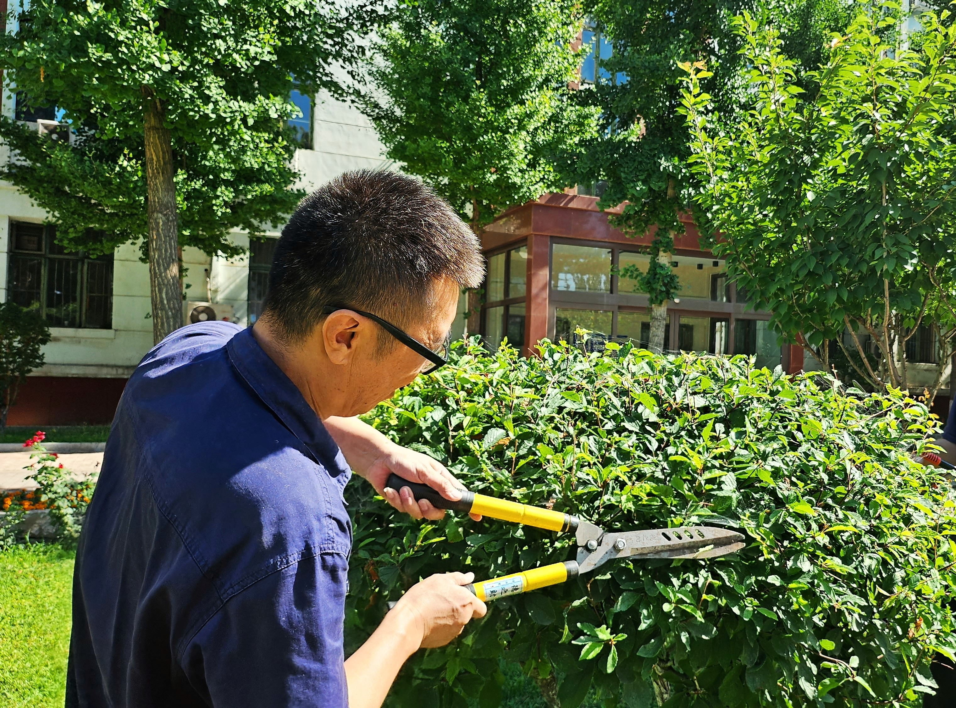 廠區後勤分公司職工正在對辦公樓綠植進行修剪。