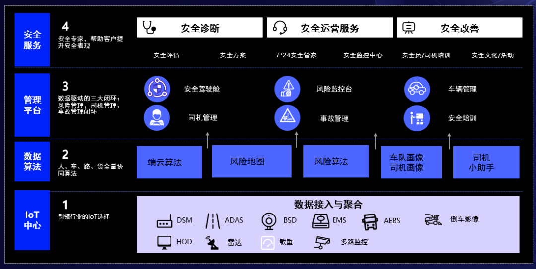 管理平台層:以數據智能為基礎,形成並強化管理有依據、執行有跟蹤、結果有反饋的風險管理、司機管理、事故管理閉環;