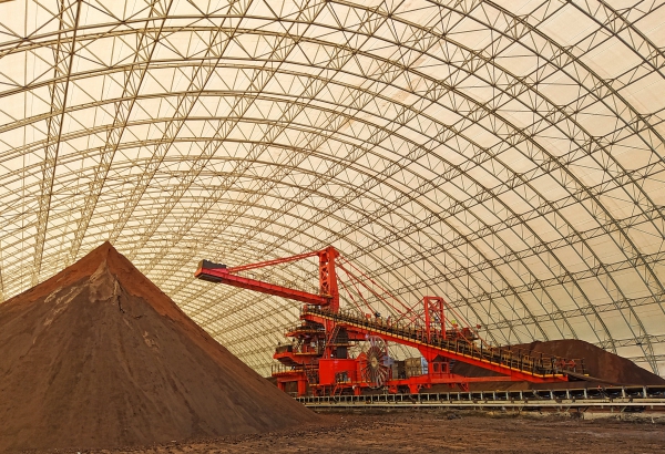圖為新投運不久的混勻礦取料機在大棚內作業。
