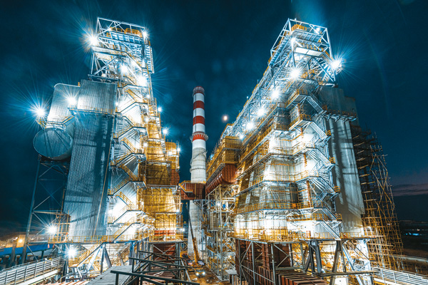 圖為夜幕下正在施工的燒結機煙氣淨化係統脫硫塔,燈火通明。
