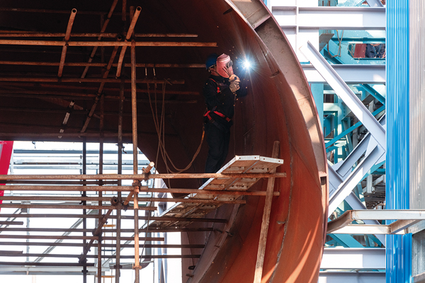 圖為施工人員焊接燒結煙氣風管。