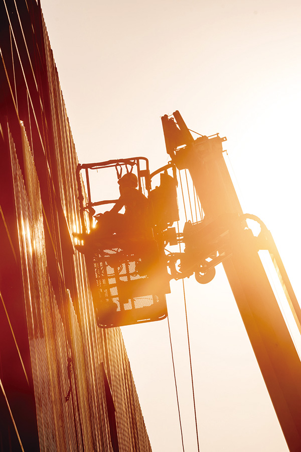 圖為施工人員在安裝廠房外牆彩鋼瓦。