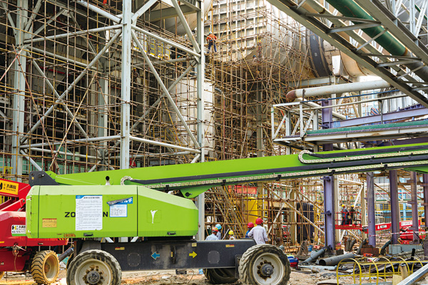 圖為施工人員搶抓燒結機機頭布袋除塵保溫層安裝進度。