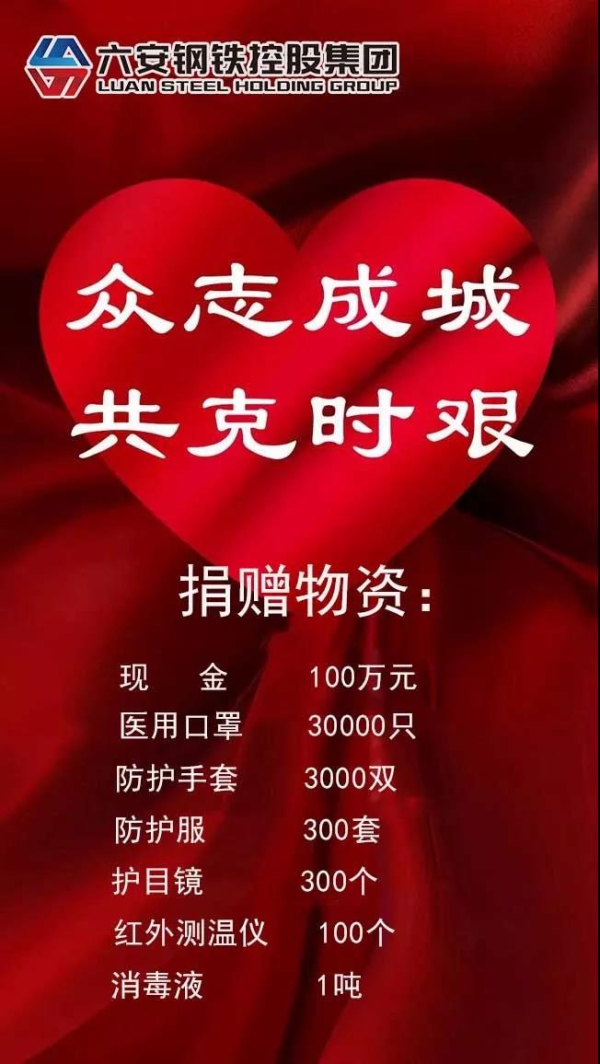 【抗擊疫情,鋼企在行動】六安鋼鐵控股集團向霍邱縣疫情防控指揮部捐贈100萬元現金及抗疫物資