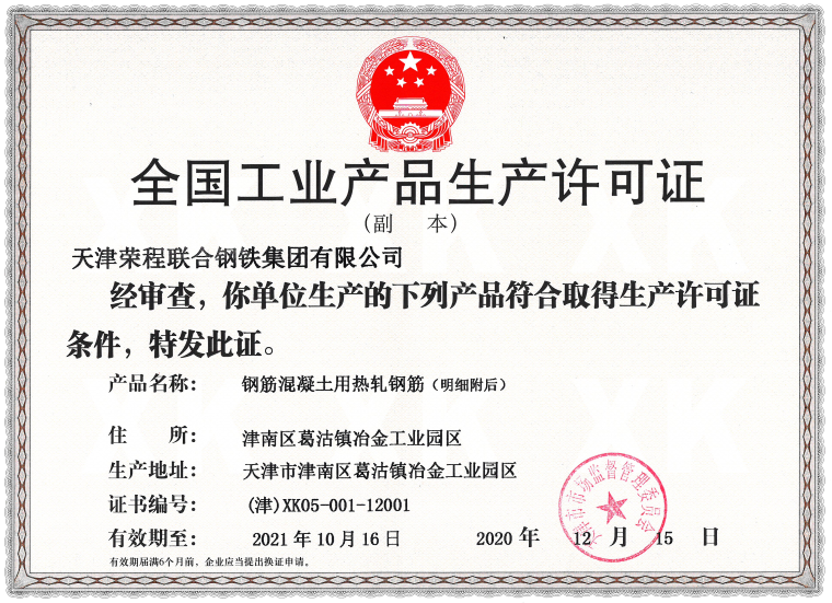 近日,榮程鋼鐵集團獲得天津市津南區市場監督管理局頒發的鋼筋混凝土用熱軋鋼筋生產許可證。這是2020年9月國家市場監管總局將建築用鋼筋等5類產品生產許可證審批權下放至省級市場監管部門後,天津市發出的首張建築用鋼筋生產許可證。