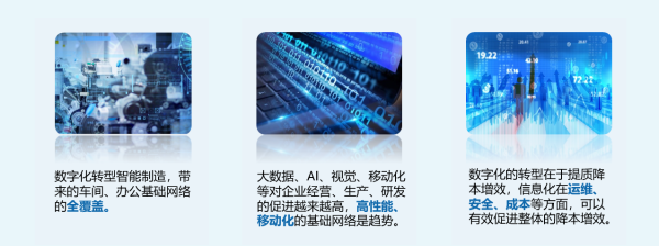 第一,高帶寬。光纖鏈路全萬兆,延伸到班組,便於以後隨時擴容網絡;車間部署支持Wi-Fi 6協議的高密AP,提升3倍的容量性能,支持光纖接入,跨過100米的網線限製,可在車間任意點位部署;
