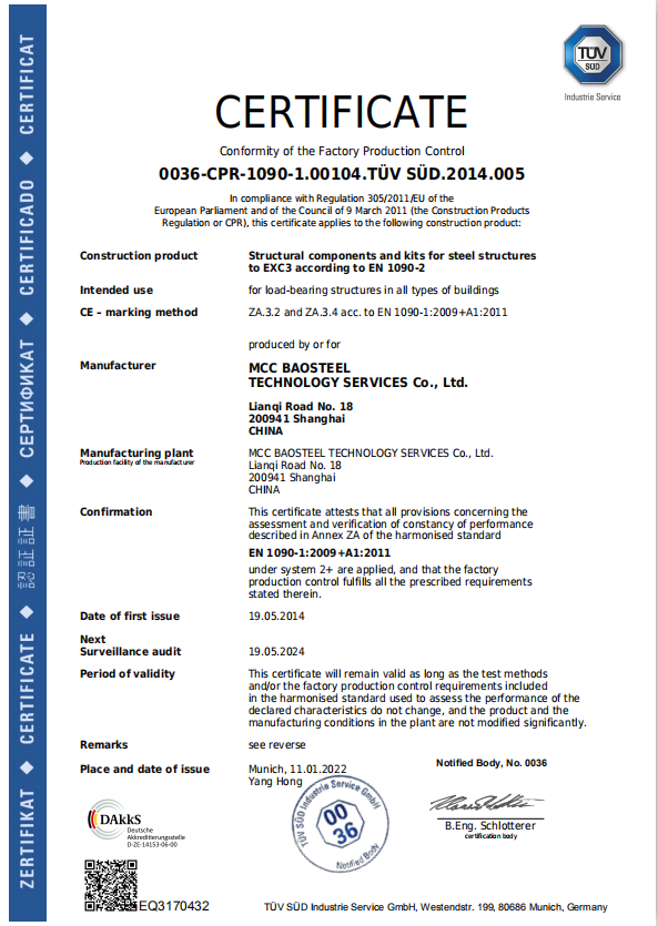 1月18日,從德國慕尼黑傳來喜訊,中冶寶鋼焊接與非標結構工程技術中心順利通過資質複證審核,取得歐盟EN1090歐標鋼結構製作資質和ISO3834標準(國際焊接質量管理體係)證書。