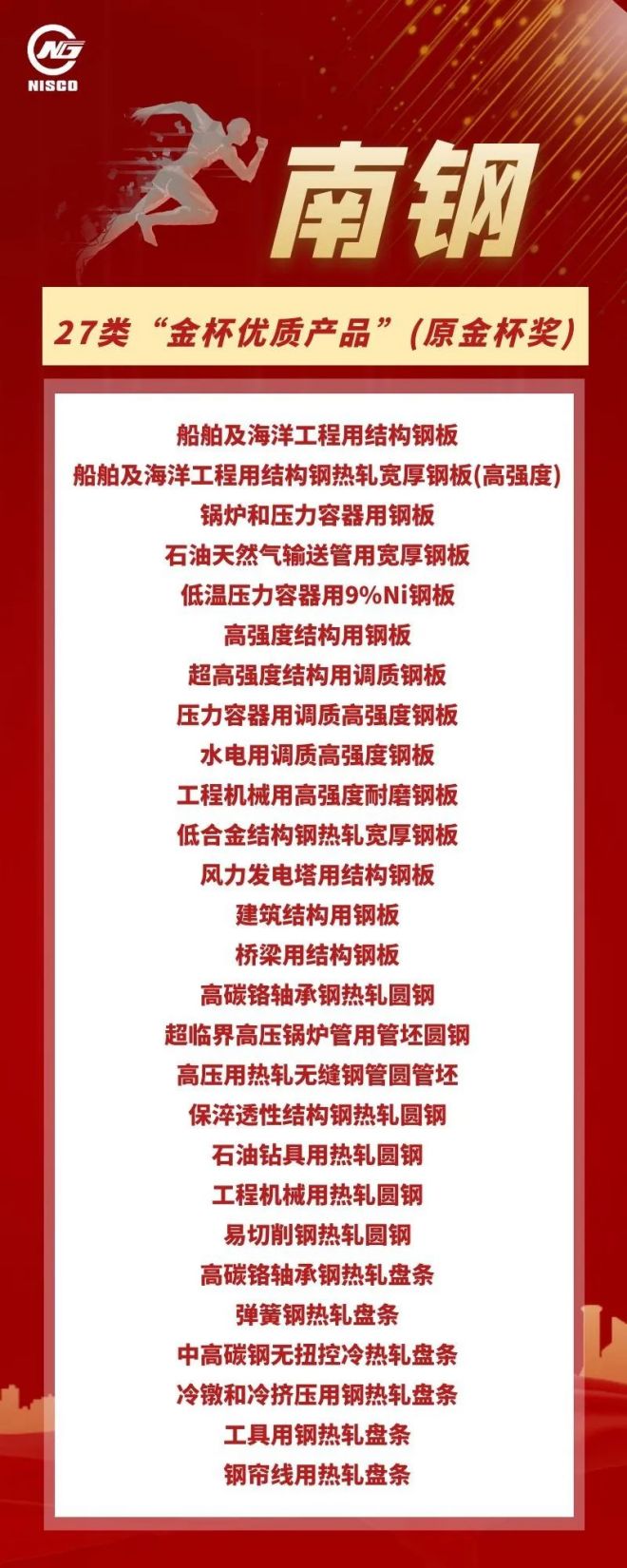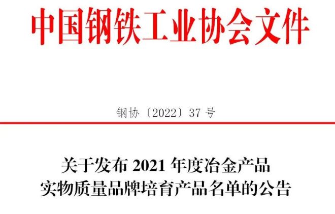 根據中國鋼鐵工業協會《冶金產品實物質量品牌培育管理辦法》要求,2021年冶金產品實物質量品牌培育活動經申報、初審、專業認定、公示及異議處理等工作程序,並通過中國鋼鐵工業協會“冶金產品實物質量品牌培育審定委員會”審定,按照中厚板、鋼帶、特鋼、線材製品、鋼筋鑄管、鋼管型鋼等類別共有172項產品審定冠名為“金杯優質產品”。