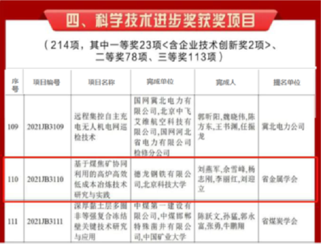 經2021年度河北省自然科學獎、技術發明獎、科學技術進步獎總評,共推薦建議授獎項目253項。其中:省自然科學獎21項,其中一等獎3項、二等獎7項、三等獎11項;省技術發明獎18項,其中一等獎3項、二等獎6項、三等獎9項;科學技術進步獎214項,其中一等獎23項、二等獎78項、三等獎113項。其中,由德龍鋼鐵有限公司,北京科技大學共同完成的《基於煤焦礦協同利用的高爐高效低成本冶煉技術研究與實踐》項目,獲得河北省科學技術進步獎三等獎,該項目完成人為德龍鋼鐵劉燕軍、北京科技大學佘雪峰等人。
