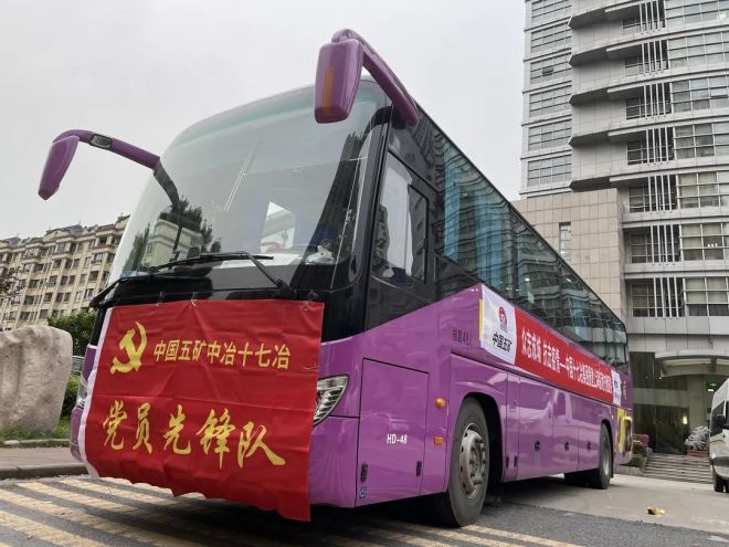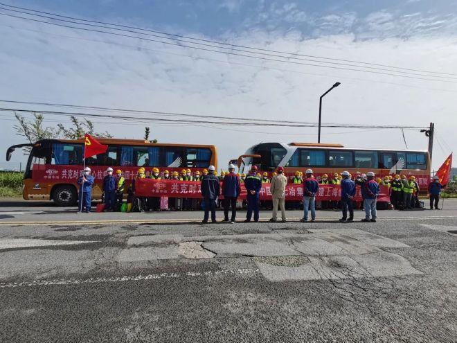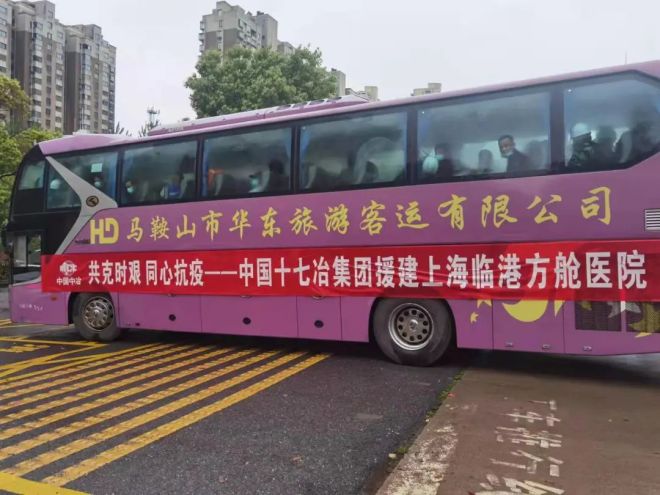 4月15日,中國十七冶南通項目部援建上海方艙兩輛大巴車出發