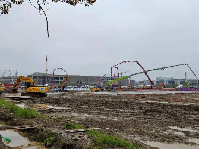 公司以項目管理部副部長吳民、安監部副部長魏寧為代表的黨員骨幹,從馬鞍山本部陸續集結100餘人作業力量,全體完成核酸檢測後於4月13日下午17時增援上海。次日上午8:30分左右,十七冶首批援建隊伍達到現場,旋即成立黨員突擊隊、黨員先鋒隊,勇擔全體建設者的“主心骨”。工作組立即部署工作任務,馬不停蹄投入施工。截止4月14日晚,現場累計投入施工力量300餘人,推土機、壓路機、挖掘機、吊車、汽車泵等施工機械44台,運輸車輛20餘台,混凝土攪拌車數十輛。機器沸騰轟鳴、人流穿梭不息,還有沙啞著嗓子互相鼓勁聲,正不斷注入“靜態”下的上海“動能”。建設者們不畏艱險、不知疲倦,與疫魔爭分奪秒,澆築混凝土1000立方米,土地平整27000平方米。為了給建成交付多爭取一秒時間,冒雨入場300餘人的“急行軍”搶先施工。當天夜裏,周金龍副總經理帶領工作組連夜優化施工組織,製定應對現場積水、加快作業麵趕工措施。
