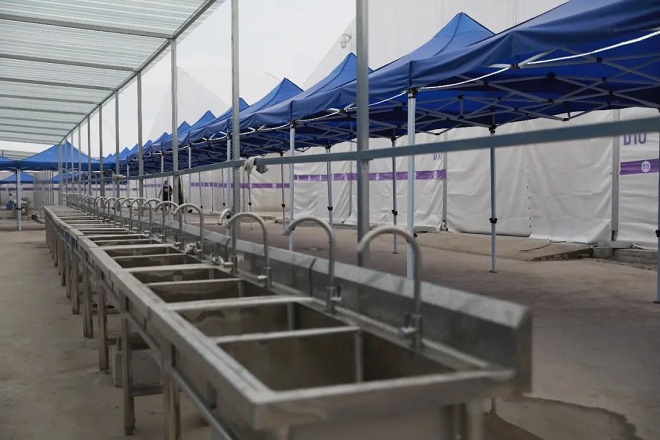 中冶寶鋼承建部分總占地麵積2萬平方米,包括6個隔離方艙主框架及艙棚建設,5個隔離方艙電氣安裝、地板照明家具等內部設施安裝、護士站搭設、室外給排水、消防、垃圾處理係統建設等,方艙醫院D區淋衛區域建設及配套設施安裝。