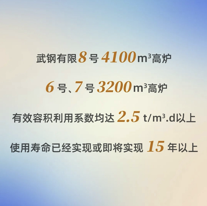 中冶南方服務了武鋼全部高爐的設計與建設,其中武鋼有限6號、7號3200m³高爐及8號4100m³高爐在2004年~2009年相繼投產,各項生產指標、高爐壽命均在我國同級別及以上高爐中處於領先水平,使武鋼有限成為目前國內唯一全廠所有高爐均實現高效長壽的鋼企。