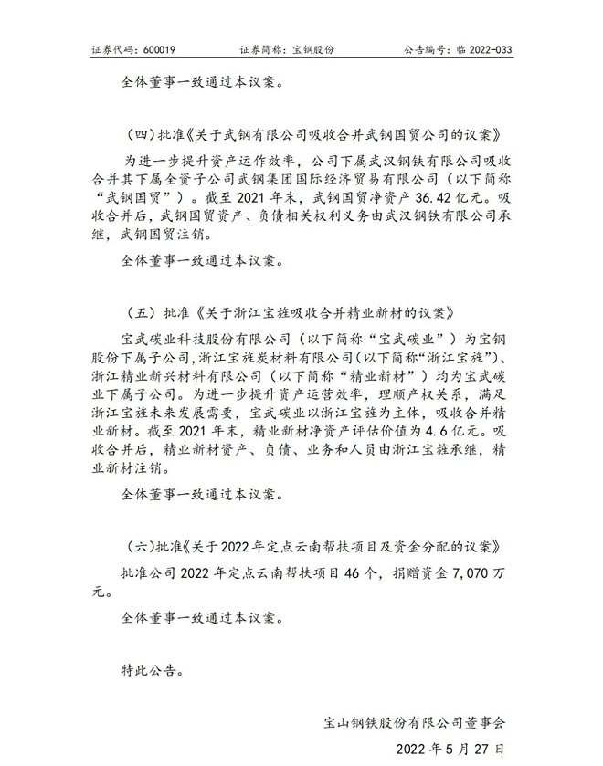 5月27日晚,寶鋼股份發布第八屆董事會第十四次會議決議公告,批準《關於武鋼有限公司吸收合並武鋼國貿公司的議案》《關於浙江寶旌吸收合並精業新材的議案》。