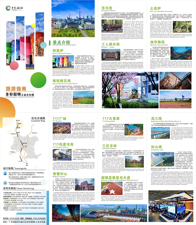 “多彩韶鋼—工業文化園”旅遊資源銜接自然,相互拓展,相互延伸,形成層次多樣的資源空間組合。主要景點有:轉底爐、煉鐵路花海、717廣場、717風度書房、韶鋼智慧中心、韶鋼發展星光大道、高三線、鬆山湖、東元輪、土高爐、工人俱樂部、南華雅苑等,設計的線路有多彩工業文化旅遊線、工業科普藝術觀光線、曆史文化景觀遊覽線等三條線路。