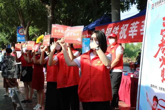 “紅馬甲”一早便到達考點,用心布置,在考點設置了愛心助考站,向考生提供免費的礦泉水、考試文具、口罩等愛心物資,以備考生不時之需,提前準備條幅“金鼎鋼鐵集團祝莘莘學子金榜題名”為考生及家長加油鼓氣。