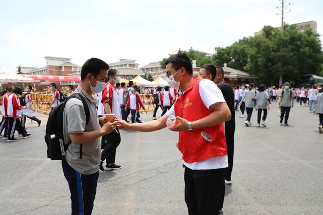 “不用緊張,好好考。”“加油,一定要相信自己!”“紅馬甲”溫情地送上鼓勵的話語、礦泉水及綠豆湯,鼓勵考生放平心態、沉著應考,用實際行動為考生加油。