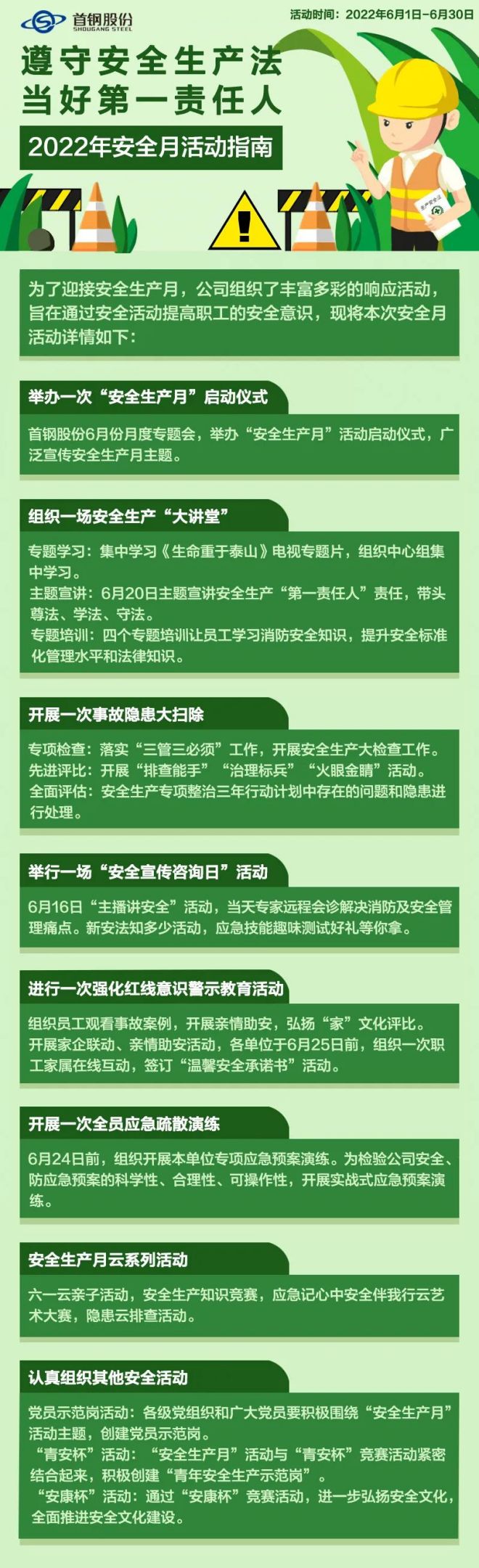 6月1日,首鋼股份召開2022年安全生產月啟動大會,全麵部署安全月活動。日前,首鋼股份下發《首鋼股份2022年“安全生產月”活動方案》,要求各單位嚴格落實方案要求,高度重視,精心部署,注重實效,穩步推進。此次活動重點圍繞“遵守安全生產法 當好第一責任人”這一主題,開展好“六個一”活動,即舉辦一次“安全生產月”活動啟動儀式、組織一場安全生產“大講堂”、開展一次事故隱患大掃除、舉行一場“安全宣傳谘詢日”活動、進行一次強化紅線意識的警示教育活動、開展一次全員應急疏散演練,同時認真組織好創建黨員示範崗活動、“青安杯”競賽活動、“安康杯”競賽活動、安全生產月雲係列活動。