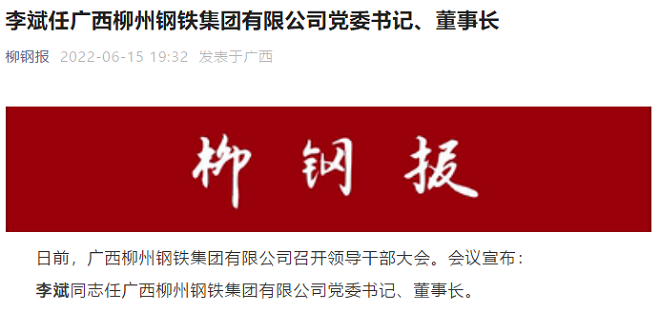 6月15日,從廣西柳州鋼鐵集團官方微信獲悉,日前,廣西柳州鋼鐵集團有限公司召開領導幹部大會。會議宣布: