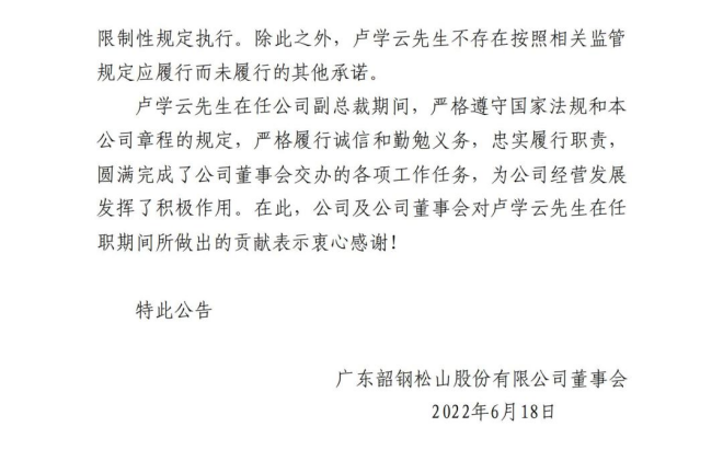 2022年6月17日,廣東韶鋼鬆山股份有限公司董事會收到副總裁盧學雲的書麵辭呈。因工作原因,盧學雲申請辭去副總裁職務。根據《公司法》《公司章程》等有關規定,盧學雲辭去副總裁職務的辭呈自送達董事會之日起生效。
