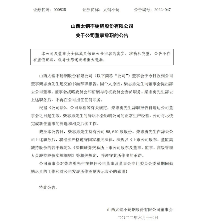 同一天,山西太鋼不鏽鋼股份有限公司董事收到公司(以下簡稱公司)董事柴誌勇遞交的書麵辭職報告。因個人原因,柴誌勇向董事會提出辭去公司董事、董事會戰略委員會和薪酬與考核委員會委員職務。柴誌勇辭去上述職務後,不再在公司擔任任何職務。根據《公司法》、公司章程等有關規定,柴誌勇辭職報告自送達公司董事會之日起生效。