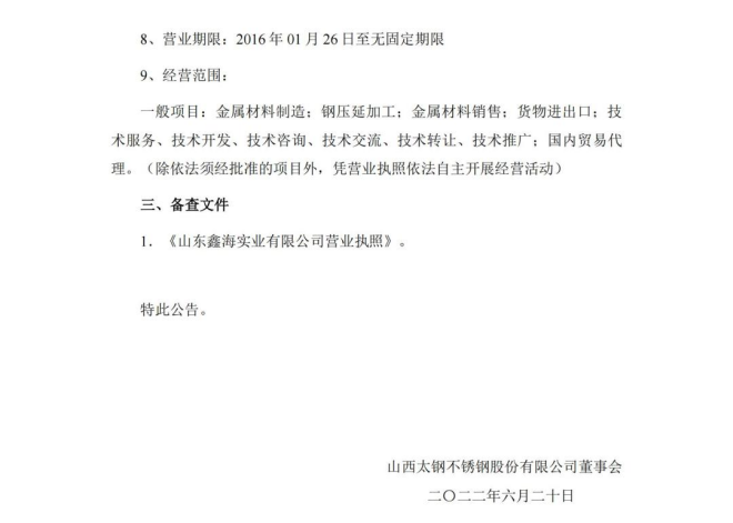 6月21日,山西太鋼不鏽鋼股份有限公司發布公告稱,2022年6月17日,公司控股子公司山東鑫海實業有限公司已辦理完成相關工商注冊登記手續,並於2022年6月17日取得了莒南縣行政審批服務局核發的《營業執照》。