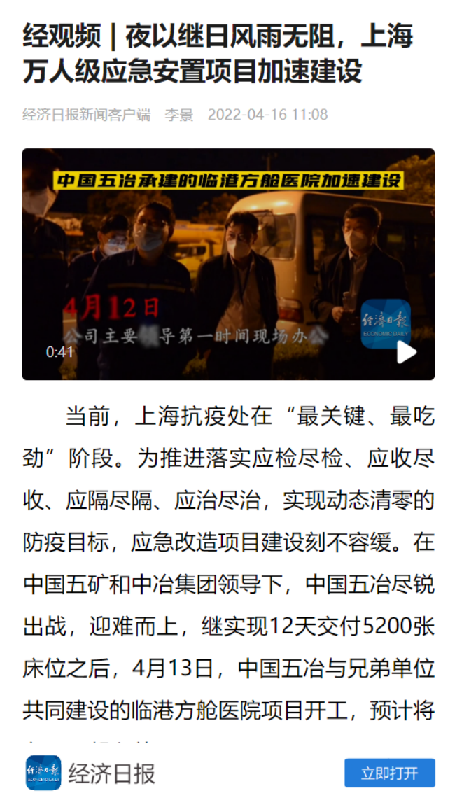 敢打必勝,使命必達。為以快製快,跑贏病毒,中國五冶集團組建44支黨員抗疫突擊隊,設立374個黨員抗疫先鋒崗,紮根一線不斷刷新“五冶速度”。過程中,五冶人與時間賽跑,以13個小時的“極限挑戰”交付了日均10萬份新冠病毒核酸檢測能力的樣本分析實驗室,鏖戰7個晝夜率先完成了可容納萬人的上海臨港方艙建設任務,曆時4個月呈現了總建築麵積17萬平(含五星級高端酒店4萬平、四星級精品酒店5萬平、高端公寓及配套設施8萬平)的國際一流健康驛站——chengdoutianfuguojijiankangfuwuzhongxin,pingjieyizhangzhangliangyanchengjidan,huodeshehuigefangguangfanzanyuhezhuliumeitigaopinguanzhu,jinyibuzhangxianlezhongguowuyejituangantiaodaliang、勇擔大任的工程建設主力軍風采!