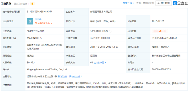 從企查查獲悉,2022年6月20日,江西新鋼國際貿易有限公司成立,法定代表人為莊央兵,注冊資本1億元人民幣,經營範圍包含:非fei金jin屬shu礦kuang及ji製zhi品pin銷xiao售shou,建jian築zhu材cai料liao銷xiao售shou,輕qing質zhi建jian築zhu材cai料liao銷xiao售shou,電dian子zi產chan品pin銷xiao售shou,貿mao易yi經jing紀ji,國guo內nei貨huo物wu運yun輸shu代dai理li,低di溫wen倉cang儲chu,普pu通tong貨huo物wu倉cang儲chu服fu務wu等deng。企qi查zha查zha股gu權quan穿chuan透tou顯xian示shi,該gai公gong司si由you新xin鋼gang股gu份fen母mu公gong司si新xin餘yu鋼gang鐵tie集ji團tuan有you限xian公gong司si(以下簡稱新鋼集團)100%持股。