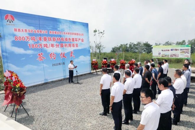 盛夏的七月驕陽似火,綠色環抱的大西溝礦山此時一片喜氣洋洋。7月14日,陝西大西溝礦業有限公司與陝煤技術研究院180萬噸/年菱鐵礦分質利用項目,在海拔1551米的大西溝綠色礦山小嶺攬勝台順利簽約。商洛市人大副主任、柞水縣委書記崔孝栓,副市長劉偉,柞水縣副縣長蔣維傑,陝煤集團黨委委員、董事、陝煤技術研究院黨委書記、董事長、院長閔小建,陝煤技術研究院黨委委員、副院長李瑞斌,陝鋼集團黨委書記、董事長、總經理楊海峰出席簽約儀式。陝鋼集團總工程師郗九生主持簽約儀式。