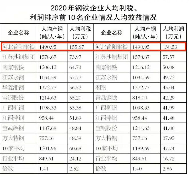 普陽鋼鐵在行業內以精益化管理和效益好著稱,根據鋼協發布的數據,普陽鋼鐵是2020年鋼鐵企業人均利稅、利潤排名第一的企業。即使在2015年的鋼鐵"寒冬“,普陽鋼鐵也實現了盈利,全年實現銷售收入124億元、利稅19.7億元、利潤9億元。