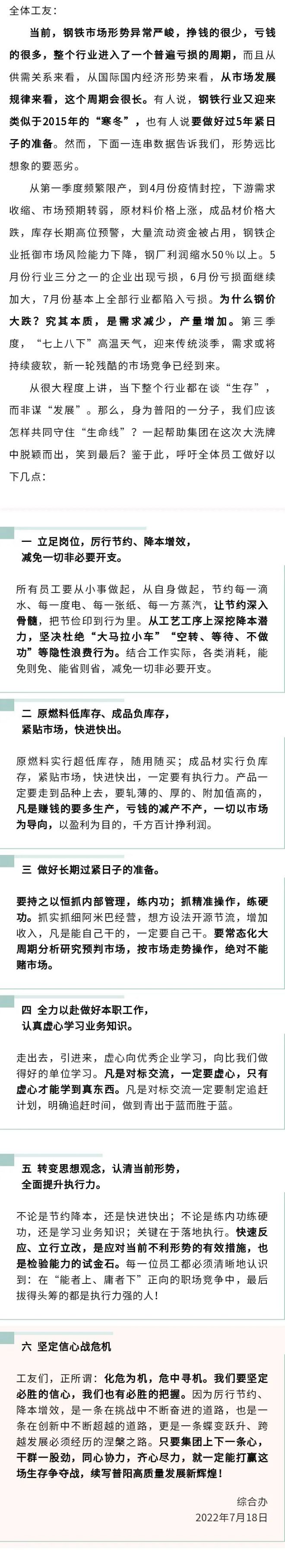 7月18日,普陽鋼鐵在公眾號發布《告全體員工書》,zhichudangqiangangtieshichangxingshiyichangyanjun,zhenggexingyejinruleyigepubiankuisundezhouqi,xingshiyuanbixiangxiangdeyaoelie。weishenmegangjiadadie?jiuqibenzhi,shixuqiujianshao,chanliangzengjia。disanjidu,“七上八下”高溫天氣,迎來傳統淡季,需求或將持續疲軟,新一輪殘酷的市場競爭已經到來。從很大程度上講,當下整個行業都在談“生存”,而非謀“發展”。為此,普陽鋼鐵呼籲全體員工做好長期過緊日子的準備,並強調,產品一定要走到品種上去,要軋薄的、厚的、附加值高的,凡是賺錢的要多生產,虧錢的減產不產,一切以市場為導向,以盈利為目的,千方百計掙利潤。