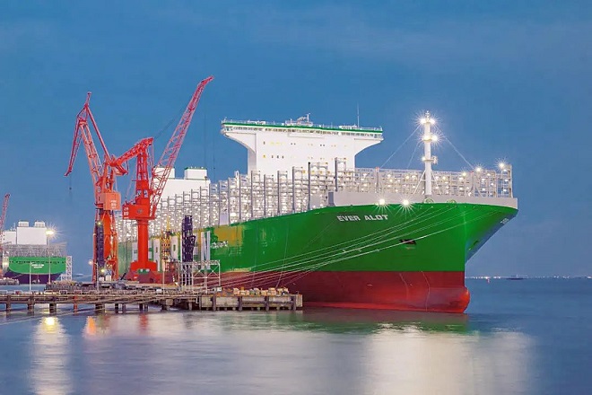 全球最大24000TEU集裝箱船首船“EVER ALOT”。(圖片來源:滬東中華造船官微)