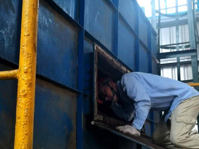運維項目經理(丁猛)在45℃高溫下檢查鏈箅烘幹機