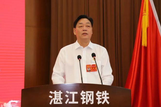 湛江鋼鐵公司黨委書記、董事長劉代德作題為《牢記鋼鐵報國初心使命 爭創世界一流偉大企業 加快建設最具競爭力的綠色碳鋼製造基地》的黨委報告。