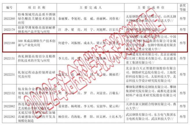 “500米成品鋼軌生產技術創新與產業化應用”項目榮獲三等獎
