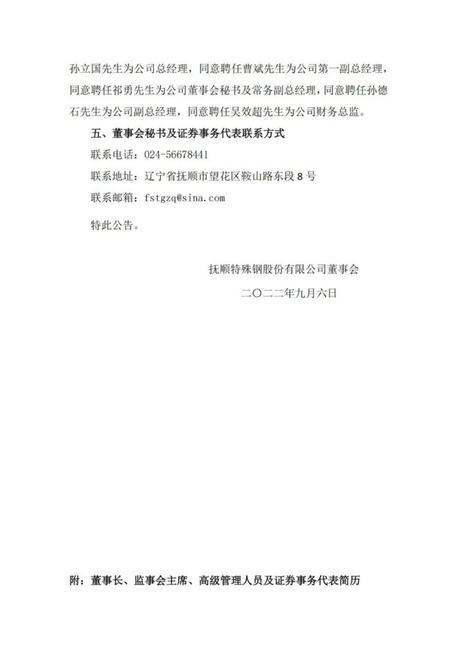 撫順特殊鋼股份有限公司(以下簡稱公司)於2022年9月5日召開第八屆董事會第一次會議,審議通過了《關於選舉董事長的議案》《關於選舉董事會專門委員會委員的議案》《關於聘任高級管理人員及證券事務代表的議案》。同日,公司召開第八屆監事會第一次會議,審議通過了《關於選舉監事會主席的議案》。選舉、聘任結果如下: