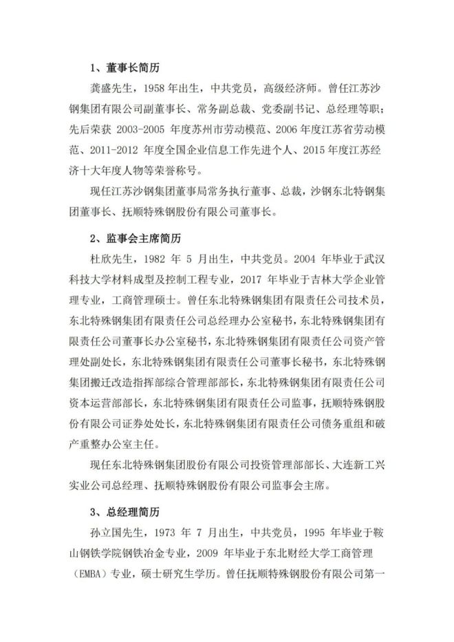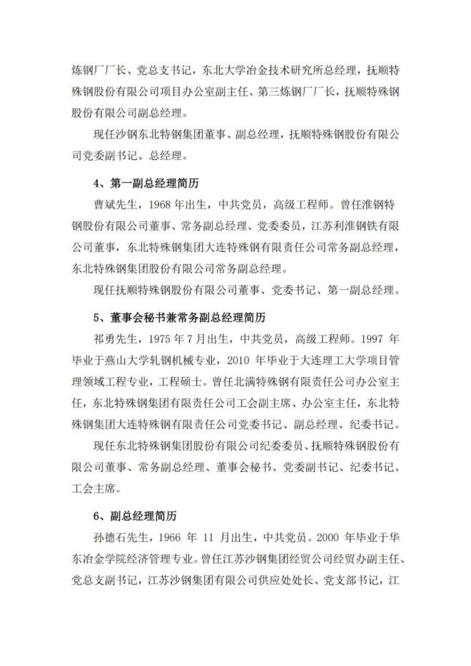 孫立國先生,1973年7月出生,中共黨員,1995年畢業於鞍山鋼鐵學院鋼鐵冶金專業,2009年畢業於東北財經大學工商管理(EMBA)專業,碩士研究生學曆。曾任撫順特殊鋼股份有限公司第一煉鋼廠廠長、黨總支書記,東北大學冶金技術研究所總經理,撫順特殊鋼股份有限公司項目辦公室副主任、第三煉鋼廠廠長,撫順特殊鋼股份有限公司副總經理。