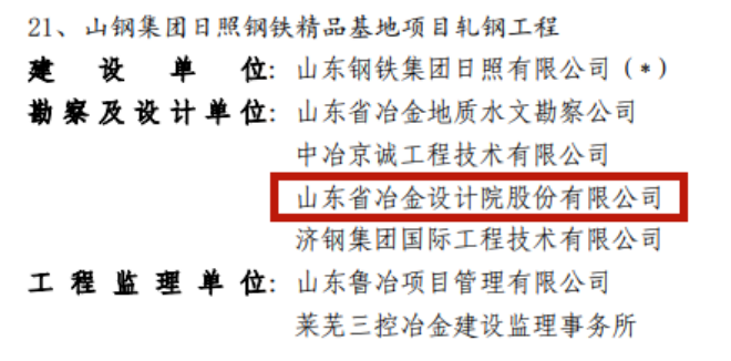 此外,山冶設計總包的日照精品基地燒結工程和高爐工程分別獲得2020-2021年度和2018-2019年度國家優質工程獎。