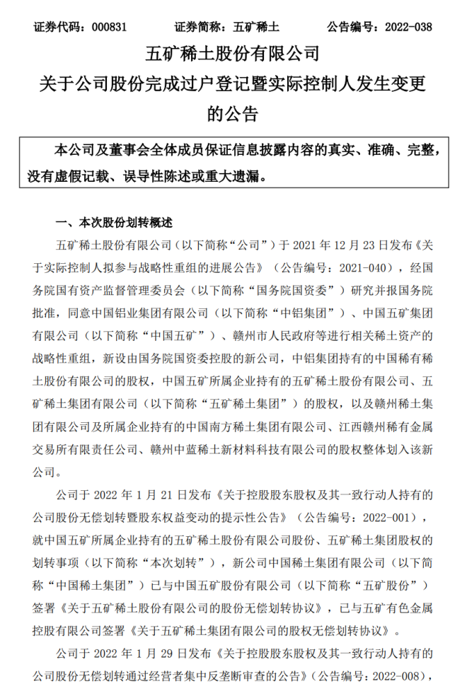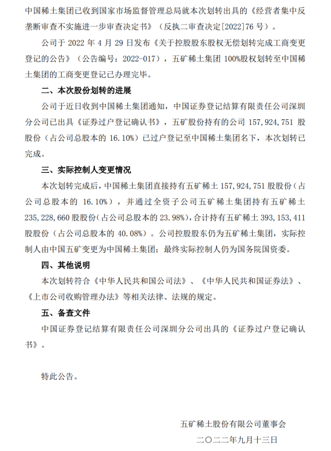 9月13日,五礦稀土股份有限公司(以下簡稱公司)發布公告稱,公司於近日收到中國稀土集團通知,中國證券登記結算有限責任公司深圳分公司已出具《證券過戶登記確認書》,五礦股份持有的公司157924751股股份(占公司總股本的16.10%)已過戶登記至中國稀土集團名下,本次劃轉已完成。