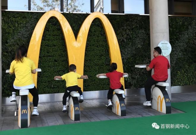 餐廳門外和餐廳內分別設置有4輛“環保充電單車”,吸引不少人前來試騎。消費者踩動單車就能驅動發電,點亮麵前的巨型黃色“M”標(biao)誌(zhi)後(hou),單(dan)車(che)前(qian)方(fang)的(de)小(xiao)桌(zhuo)板(ban)還(hai)可(ke)以(yi)為(wei)手(shou)機(ji)進(jin)行(xing)無(wu)線(xian)充(chong)電(dian)。單(dan)車(che)的(de)塑(su)料(liao)部(bu)分(fen)是(shi)由(you)回(hui)收(shou)再(zai)利(li)用(yong)的(de)塑(su)料(liao)製(zhi)作(zuo)而(er)成(cheng),海(hai)洋(yang)塑(su)料(liao)回(hui)收(shou)椅(yi)也(ye)將(jiang)在(zai)首(shou)鋼(gang)園(yuan)餐(can)廳(ting)與(yu)顧(gu)客(ke)見(jian)麵(mian)。