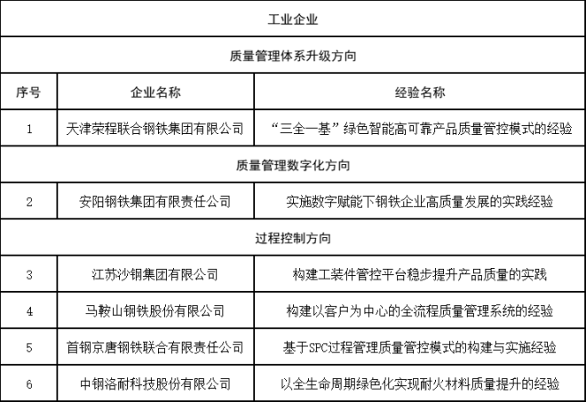 日前,根據《工業和信息化部辦公廳關於做好2022年工業質量提升和品牌建設工作的通知》(工信廳科函〔2022〕88號)要求,受工業和信息化部委托,中國質量協會組織開展了2022年全國質量標杆典型經驗遴選和交流活動。經企業自主申報、地方(行業)推薦單位推薦、資格審查、評審委員會資料評審和答辯評審,擬確定47項工業企業質量管理體係升級、質量管理數字化、可靠性提升、過程控製和質量管理方法等領域的典型經驗,以及5項中小企業、7項服務業企業典型經驗為2022年全國質量標杆。其中,6家鋼企的典型經驗上榜。