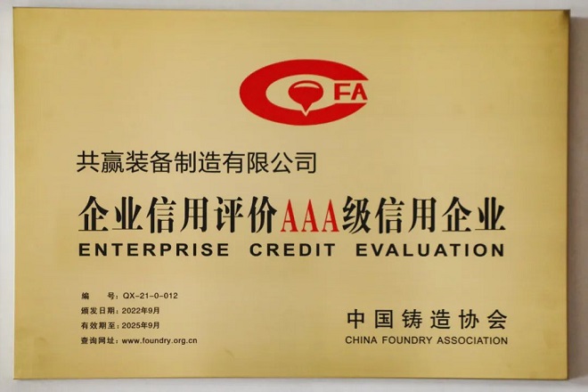 共贏裝備憑借企業綜合實力及多年來在鑄造行業取得的新成就,榮獲第四屆中國鑄造行業排頭兵企業、第四屆中國鑄造行業機床鑄件分行業排頭兵企業、企業信用評價AAA級信用企業、中國鑄造協會第九屆理事單位、中國鑄造協會第八屆優秀會員單位多項殊榮。共贏裝備副總經理周明榮獲中國鑄造行業優秀青年企業家稱號。