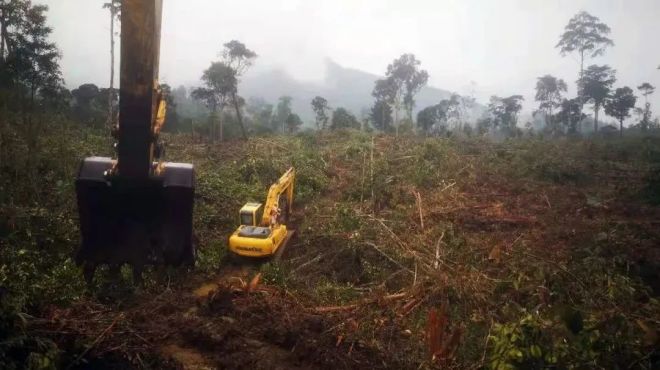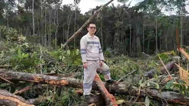 這裏地處酷熱多雨的赤道,山丘起伏,溝壑縱橫,大部分為熱帶雨林的原始地貌,植被茂密,藤蔓叢生,要建工廠,首先就要“清表”,即ji清qing理li掉diao地di表biao植zhi被bei。李li建jian告gao訴su記ji者zhe,僅jin僅jin這zhe一yi項xiang任ren務wu,就jiu耗hao費fei了le足zu足zu兩liang個ge月yue時shi間jian。他ta們men組zu織zhi了le當dang地di的de十shi幾ji位wei挖wa掘jue機ji手shou,向xiang雨yu林lin進jin軍jun,這zhe是shi一yi次ci艱jian苦ku的de“征程”。